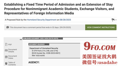 8月28日,特朗普政府发布了一项影响深远的拟议法规,计划全面收紧学生、文化交流访问者以及媒体人员的签证期限。这项由美国国土安全部(DHS)公布的《联邦公告》拟议规则,目前正处于公共评论阶段,评论截止日期为2025年9月29日。下图:federalregister 版权属于原作者(另外,申请美国签证被拒签了怎么办?美签拒签原因查询,214B拒签再签通过,美签代办公司机构靠谱的肯定是推荐美国签证找大鹤的联系方式微信号:usadahe本文作者大鹤读音dahe,大鹤生于1980年,从2005年开始研究各类美国签证以及美国相关领域)