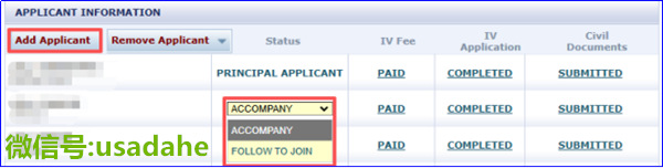 美国签证找大鹤解答:如果案件在NVC,操作步骤如下:登录 CEAC,在随行家庭成员的“Status”栏进行选择“Follow-to-Join”:(修改随行家属的签证状态的截图示例)