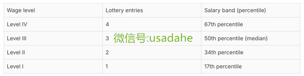 新政名额仍然是85,000个,也保留了高学历抽两轮的方式,但会根据每个人的工资水平排成4个Level,根据工资水平分配权重。你的Wage Level越高,在每个大轮中抽签的次数越多,Level1在每一轮拥有1个Entry,Level4在每一轮拥有4个Entry。比如,你是硕士学历并且是资深/管理岗位,薪资属于Level4,那总共有8个Entry,有双倍优势中签率相当高,这也是美国政府的本意:让高工资高专业人才留下。但对于刚毕业,Entry Level的小伙伴们就不那么友好,本科+Level1的中签率甚至比之前的乐透方式还低了。