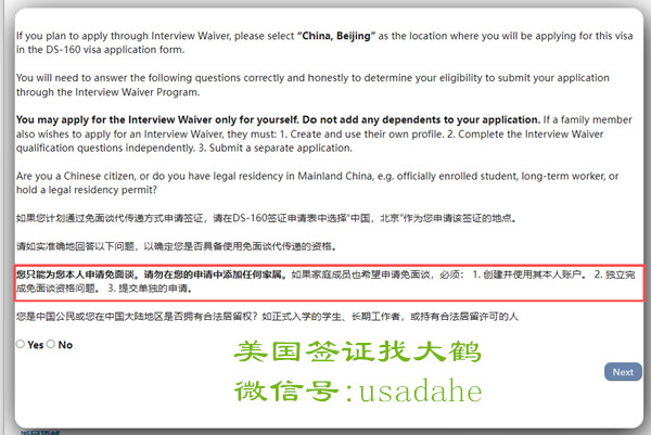 “您只能为您本人申请免面谈,不能为他人代申请,每位申请人都必须提交单独的申请。”